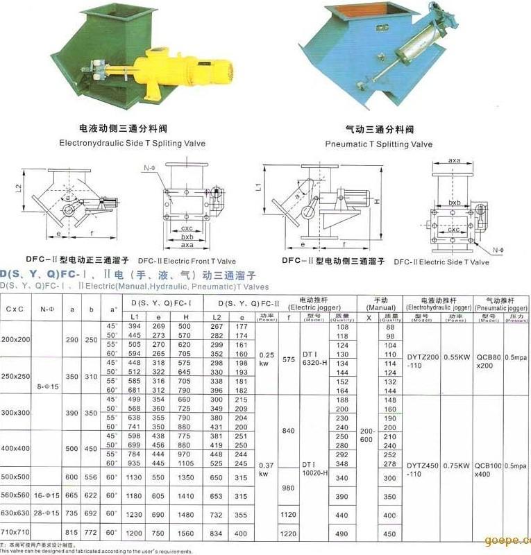三通分料器別名三通卸灰閥。三通分料器有電液動,電動,氣動,手動等幾種啟動方式,所以又叫電液動三通分料器,電動三通分料器,氣動三通分料器,手動三通分料器。可以直接將上部法蘭接在膠帶機頭部漏斗下或其它設(shè)備下料接口處,其一般用于在堆比重小于等于2.8t/m、且磨琢性較大、工作環(huán)境惡劣的條件下。考慮到其結(jié)構(gòu)尺寸大、重量大(耐磨襯板較厚),上部法蘭無法承受自身重量,使用須根據(jù)實際情況另加支承。
