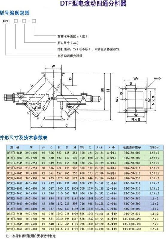 四通分料器主要由閥體、閥軸、閥板、曲柄機構、電液推桿等組成,工作時電液推桿的直線往復運動通過曲柄帶動閥軸、閥板作一定角度的擺動,從而輸送物料、控制物料的流向及流量。 DTF型電液動四通分料器采用優質碳素鋼板焊接結構、具有體積小、總量輕、阻力小等特點。采用電液推桿驅動,運行平穩、故障率低、可以快速切換物料流向,也可以接受調節或變送單元信號進行自動控制。四通分料器是我公司根據市場需要開發的系列產品,是物料輸送系統中實現物料快速換向的理想設備,廣泛應用于建材、冶金、礦山、輕工、電力、糧食等行業固體顆粒和粉狀物料的輸送。
